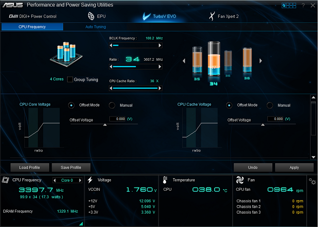 The TurboV EVO menu is where the user find the adjustments for overclocking. The CPU frequency menu has a group tuning and single core tuning function. Turbo frequency multiplier, BCLK frequency, and CPU cache ratio are adjusted here. Profiles can be saved or loaded here as well.